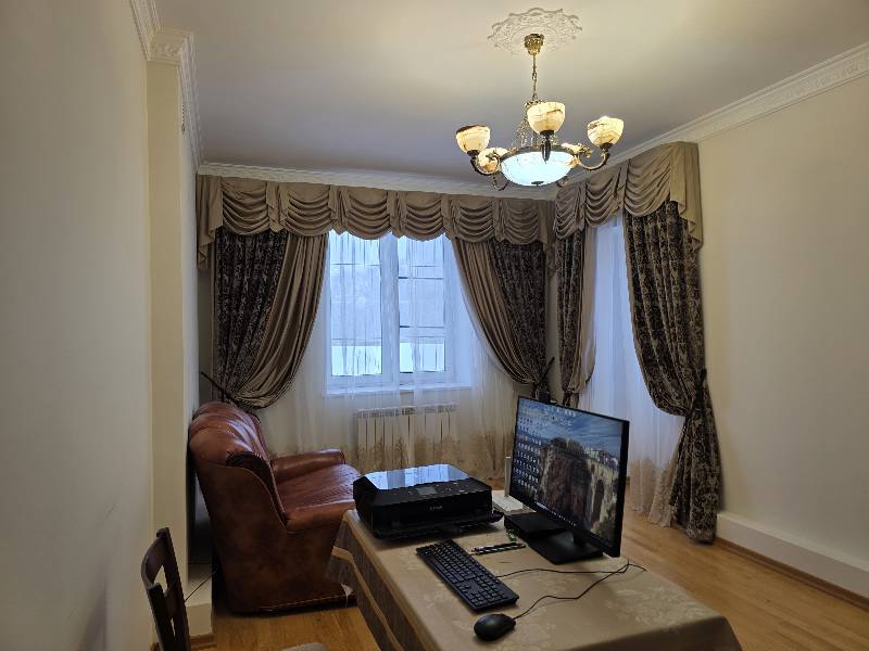 - Помещение свободного назначения, с эксклюзивной люстрой с плафонами из природного опала, двумя комплектами дизайнерских штор и выходом на балкон. Это помещение может быть использовано в качестве детской комнаты, или комнаты для игр, или дополнительной (временной) спальни и др.