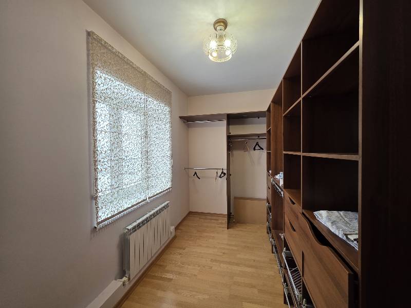 - Гардеробная, с вешалкой, стеллажом для хранения белья, туалетной тумбой, зеркалом и люстрой.