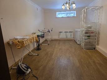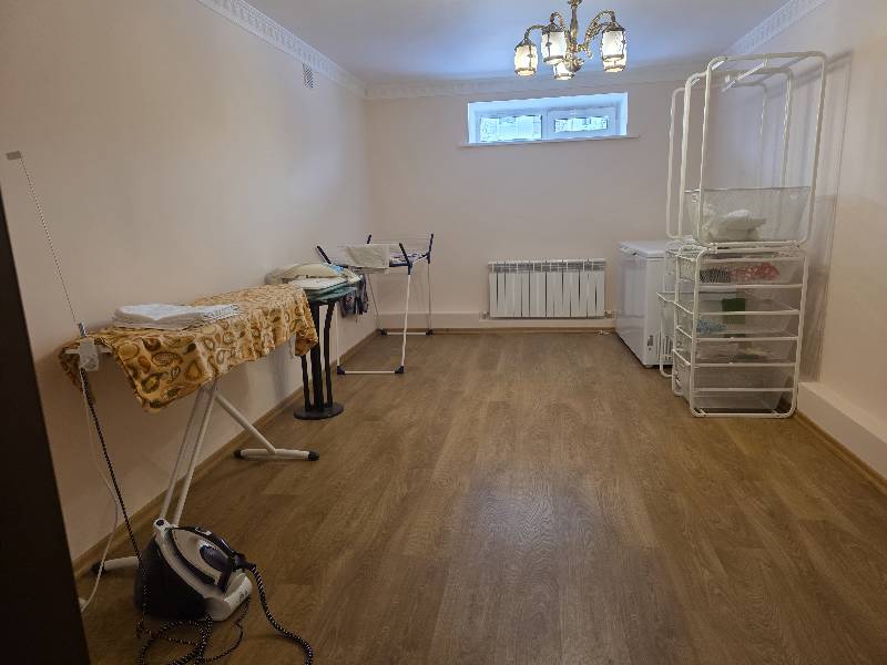 - Гладильная комната, с прессом для глажения футболок, стеллажом для белья, горизонтальным морозильником и люстрой.