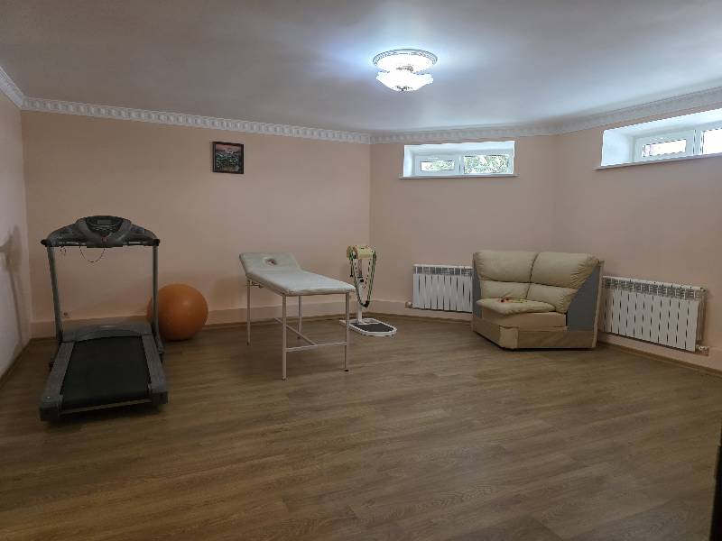 - Тренажерный зал с беговой дорожкой, массажным столом и большим мячом.
