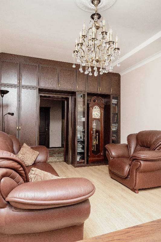 - Уютный основной кабинет с камином на дровах, двухуровневым потолком, шкафом, письменным столом, диваном и креслом, покрытых кожей; люстрой производства Италии с кристаллами хрусталя; эксклюзивными шторами.