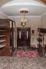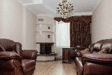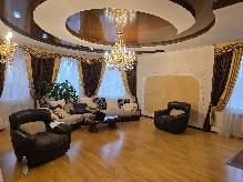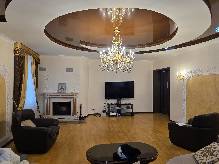 - Просторный, удобный зал – гостиная для отдыха и развлечений, с камином на дровах, журнальным столиком, большим телевизором, большим полукруглым диваном и двумя крутящимися креслами, покрытыми кожей. Дизайнерское оформление включает лепнину на двух стенах; двухуровневый потолок с натяжными вставками, шестью потолочными точечными источниками света и очень большой красивой люстрой производства Италии с кристаллами хрусталя; два настенных светильника с кристаллами хрусталя, четыре комплекта эксклюзивных штор.