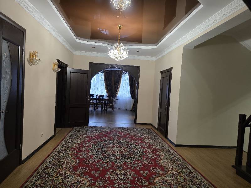 - Просторный холл с двухуровневым потолком с натяжной вставкой и четырьмя точечными источниками света; люстрой, двумя светильниками и большим ковром.