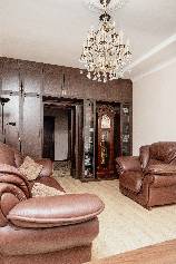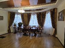 - Просторная столовая с двухуровневым потолком с натяжными вставками и люстрой; с большим, раздвижным столом, стульями, комодом с зеркалом, тремя картинами и тремя комплектами дизайнерских штор. Из столовой есть выход балкон.