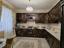 - Большая кухня с полным набором необходимой кухонной мебели и техники: со столом, стульями, дизайнерскими шторами, люстрой, телевизором, холодильником с морозилкой, газовой плитой и духовкой, вытяжкой, посудомоечной машиной.