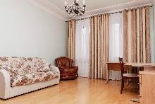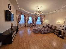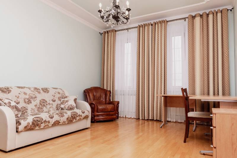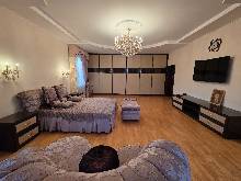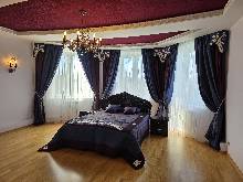 - Основная, самая большая, спальня с двухуровневым потолком, кроватью, банкеткой, двумя прикроватными тумбами, мини диваном, большим встроенным шкафом для хранения вещей, большим телевизором, тумбой; большой красивой люстрой производства Италии, с кристаллами хрусталя; четырьмя комплектами дизайнерских штор.