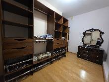 - Гардеробная, с вешалкой, стеллажом для хранения белья, туалетной тумбой, зеркалом и люстрой.