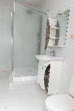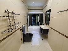 - Большой санузел с подвесным потолком, девятью точечными источниками света; с большой кабиной, в которой джакузи и душ; с умывальником с тумбой и зеркалом; с унитазом, полотенцесушителем и двумя вешалками.