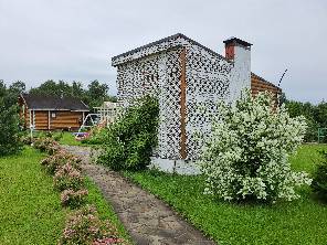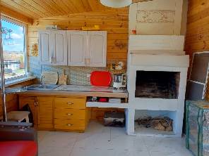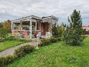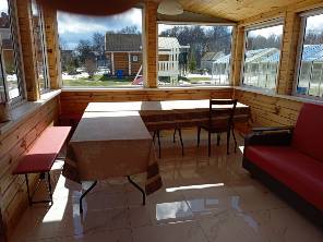 Большая беседка (7х6), построена из дерева, красиво оформленная, с большим столом, лавками, диваном, местом для приготовления горячей пищи (очаг или печь для барбекю), навесными шкафчиками для посуды и часами.
