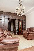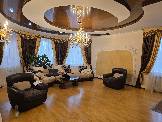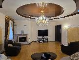 - Просторный, удобный зал–гостиная для отдыха и развлечений, с камином на дровах, журнальным столиком, большим телевизором, большим полукруглым диваном и двумя крутящимися креслами, покрытыми кожей. Дизайнерское оформление включает лепнину на двух стенах; двухуровневый потолок с натяжными вставками, шестью потолочными точечными источниками света и очень большой красивой люстрой производства Италии с кристаллами хрусталя; два настенных светильника с кристаллами хрусталя, четыре комплекта эксклюзивных штор.