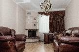 - Уютный кабинет с камином на дровах, двухуровневым потолком, шкафом, письменным столом, диваном и креслом, покрытых кожей; люстрой производства Италии с кристаллами хрусталя; эксклюзивными шторами.