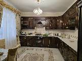 - Большая кухня с полным набором необходимой кухонной мебели и техники: со столом, стульями, дизайнерскими шторами, люстрой, телевизором, холодильником с морозилкой, газовой плитой и духовкой, вытяжкой, посудомоечной машиной.
